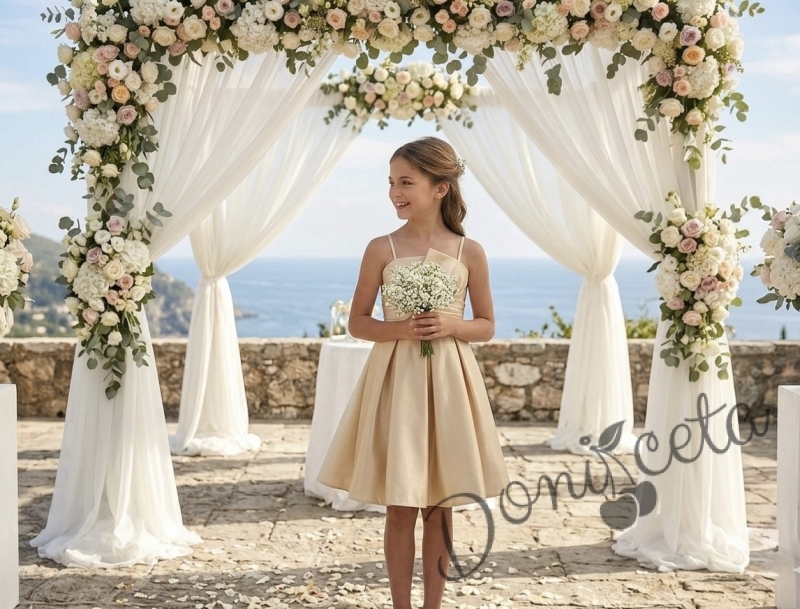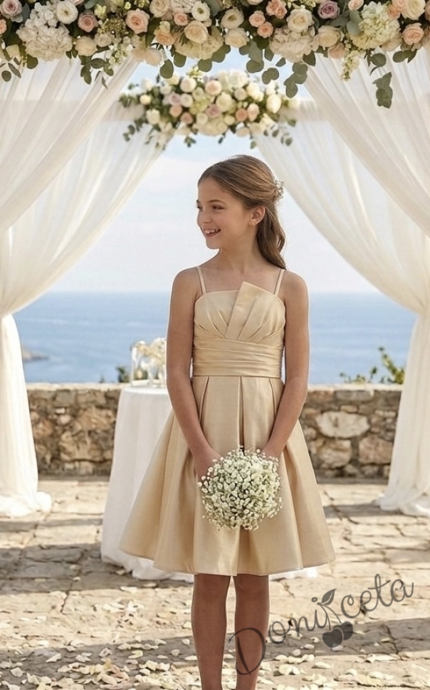 Елегантна къса официална детска рокля Лара с асиметрично деколте в златисто