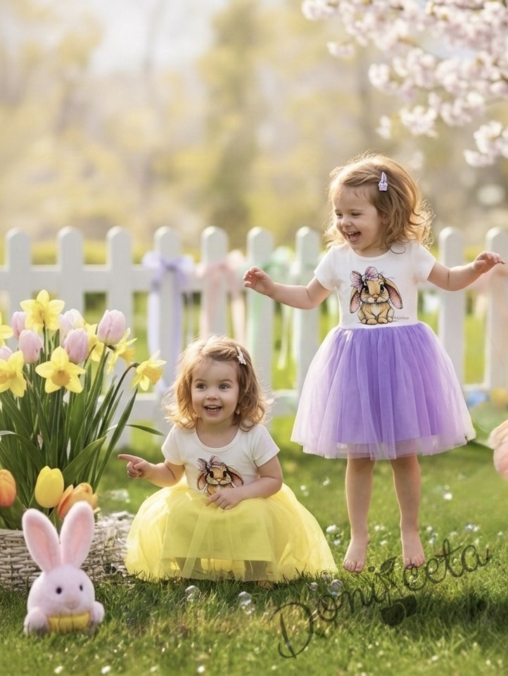 Начало МОМИЧЕТА Бебешка или детска рокля с къс ръкав в лилаво със зайче