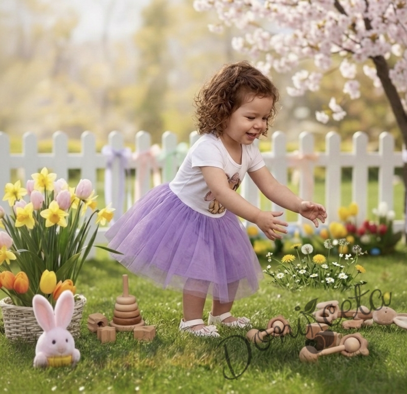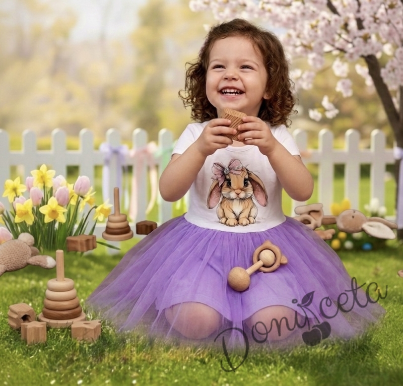 Бебешка или детска рокля с къс ръкав в лилаво със зайче