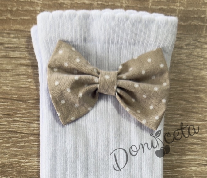 • Комплект от чорапки и диадема, който се състои от ръчно изработена диадема и чорапки с панделки в бежово на бели точици.
