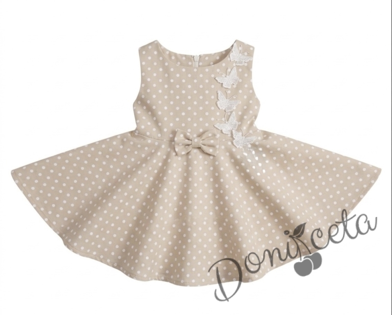 Начало МОМИЧЕТА Официална или ежедневна детска рокля клош в бежово на точки Вилина с бели 3D пеперудки