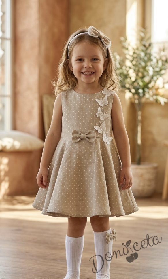 Официална или ежедневна детска рокля клош в бежово на точки Вилина с бели 3D пеперудки