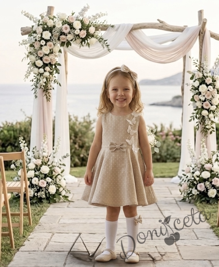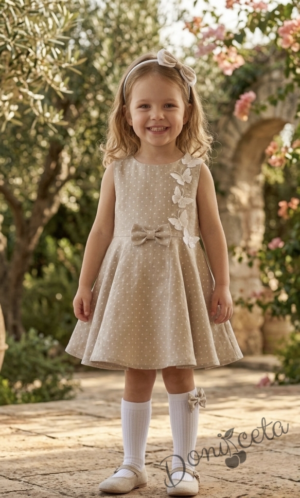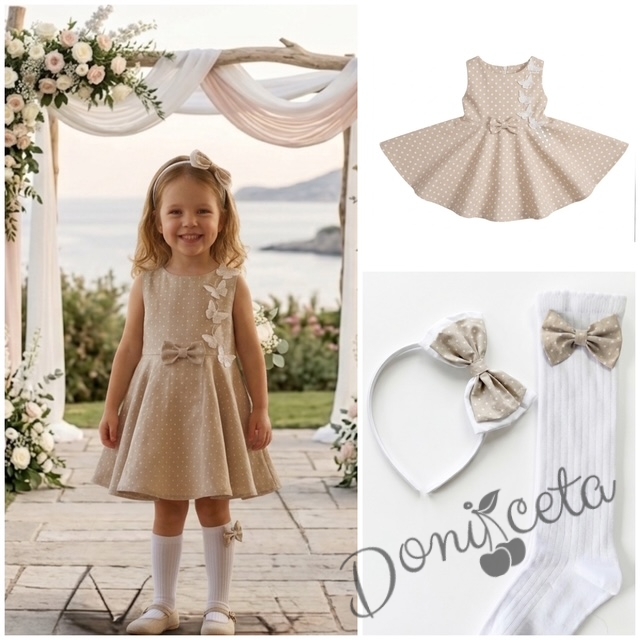Комплект от 3 части-детска рокля клош в бежово на бели точки Вилина с бели 3D пеперудки, диадема и чорапки