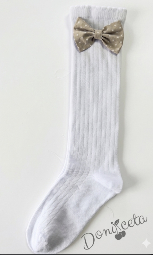 - Комплект от красива детска/бебешка памучна рокля в нежно бежово на бели точки с диадема и чорапки с панделки от плата на роклята.