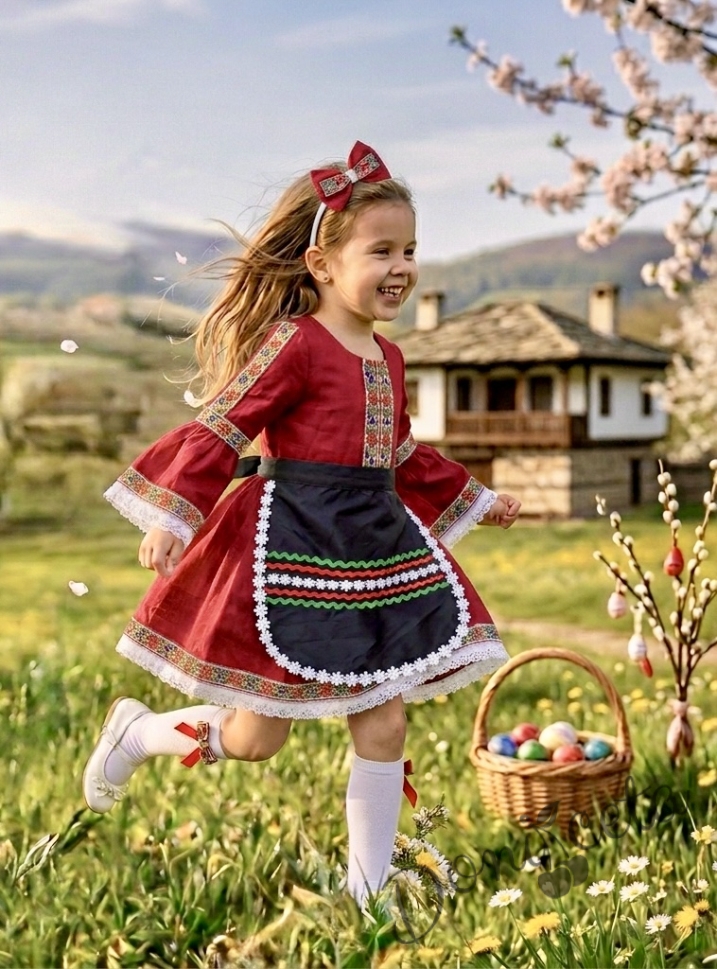 Начало МОМИЧЕТА Комплект от детска етно рокля Ели в червено тип носия с ръкав до лакътя с фолклорни мотиви и престилка