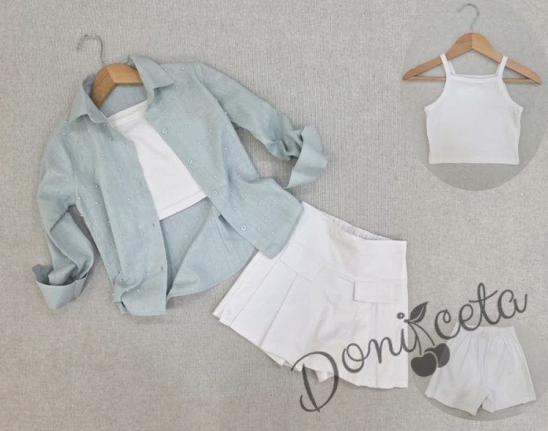 Комплект за момиче от 3 части - риза с дълъг ръкав в тюркоаз , бял топ и къси панталонки с висока талия в бяло