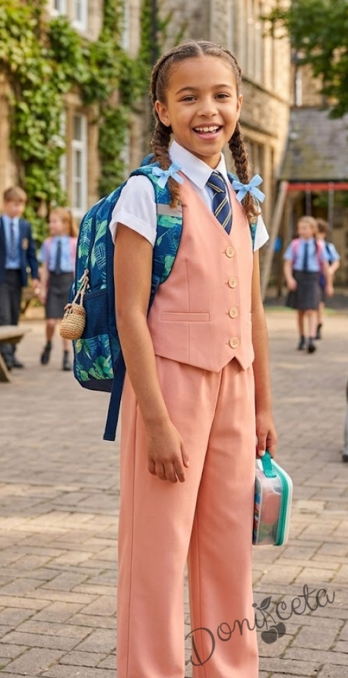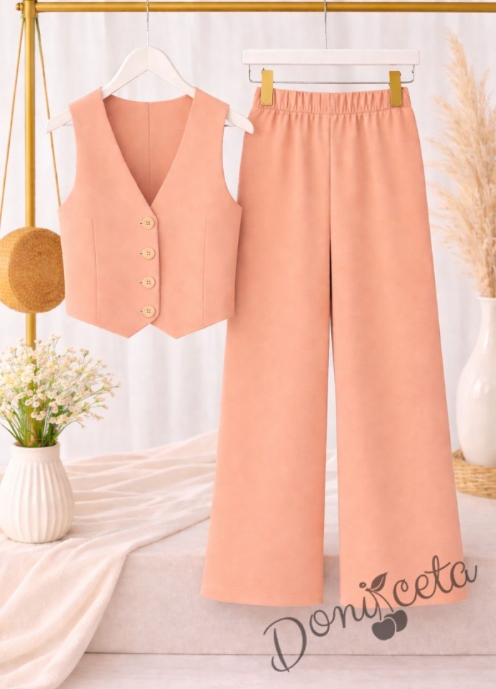 Комплект от 2 части - елек и разкроен панталон в прасковено, подходящ и за ученическа униформа