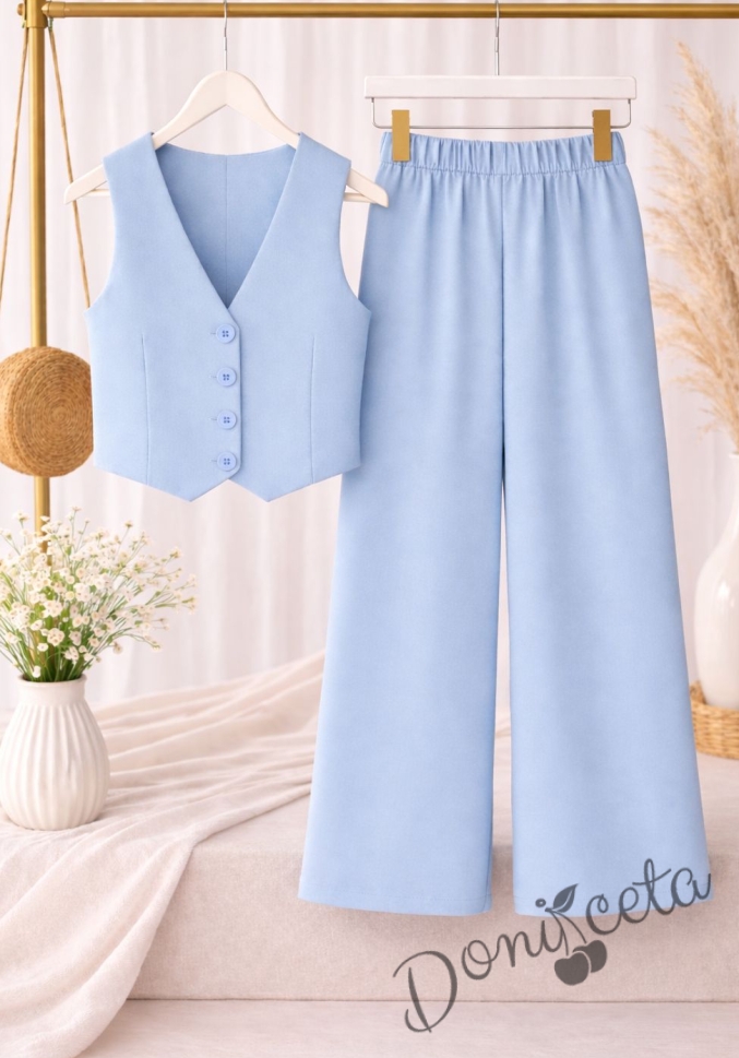 Комплект от 2 части - елек и разкроен панталон в светлосиньо, подходящ и за ученическа униформа