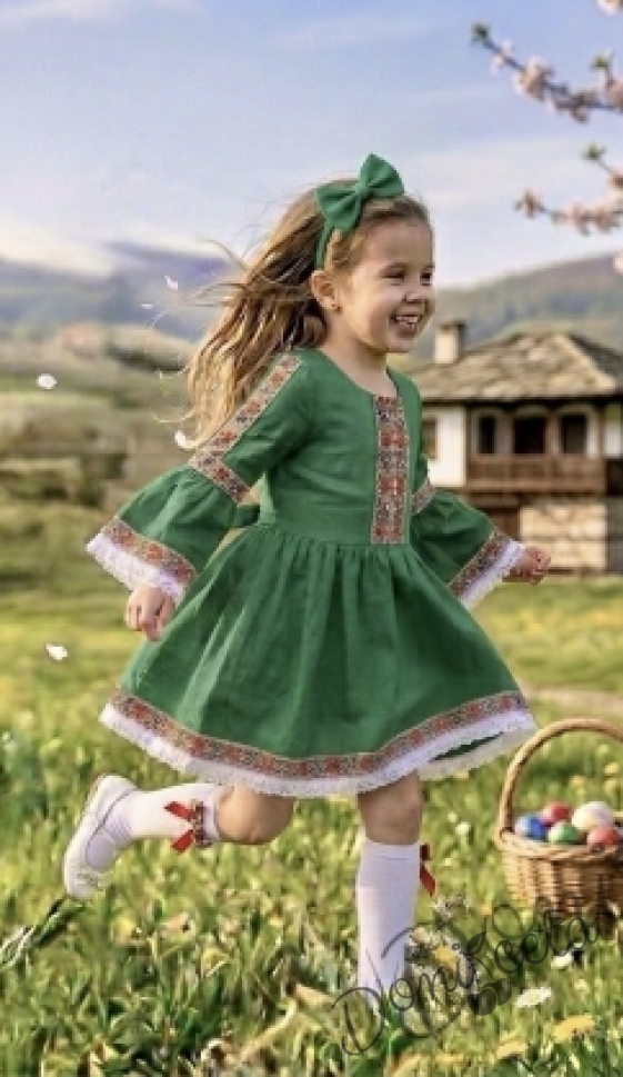 Детска етно рокля Ели в зелено тип носия с ръкав до лакътя с шевица и фолклорни мотиви