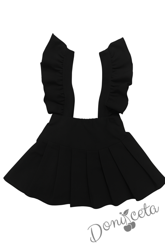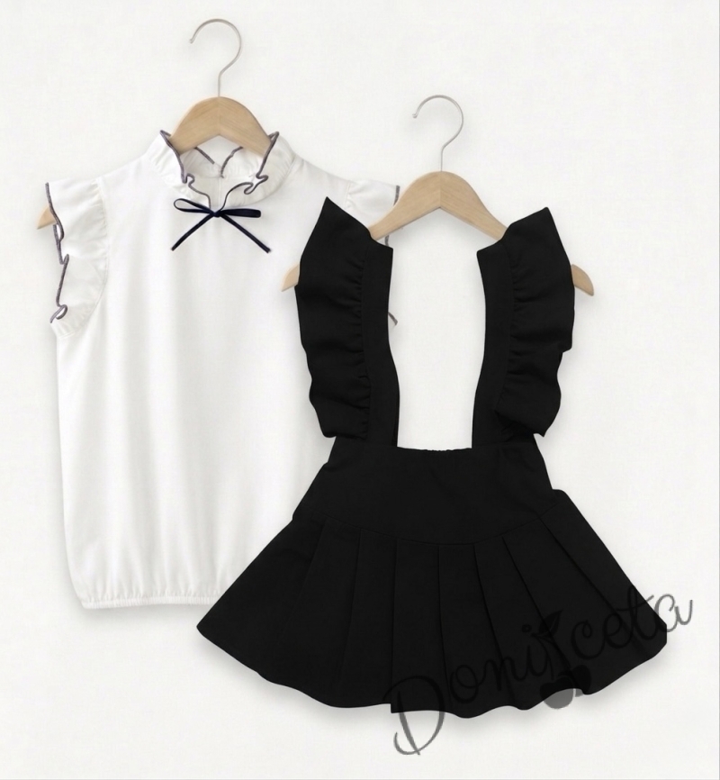 Представяме ви очарователния комплект, включващ сукман в черно с къдрички и блуза с къс ръкав, украсена с панделка и нежни къдрички. Този комплект е перфектният избор за малките дами, които обичат да изглеждат стилно и елегантно.