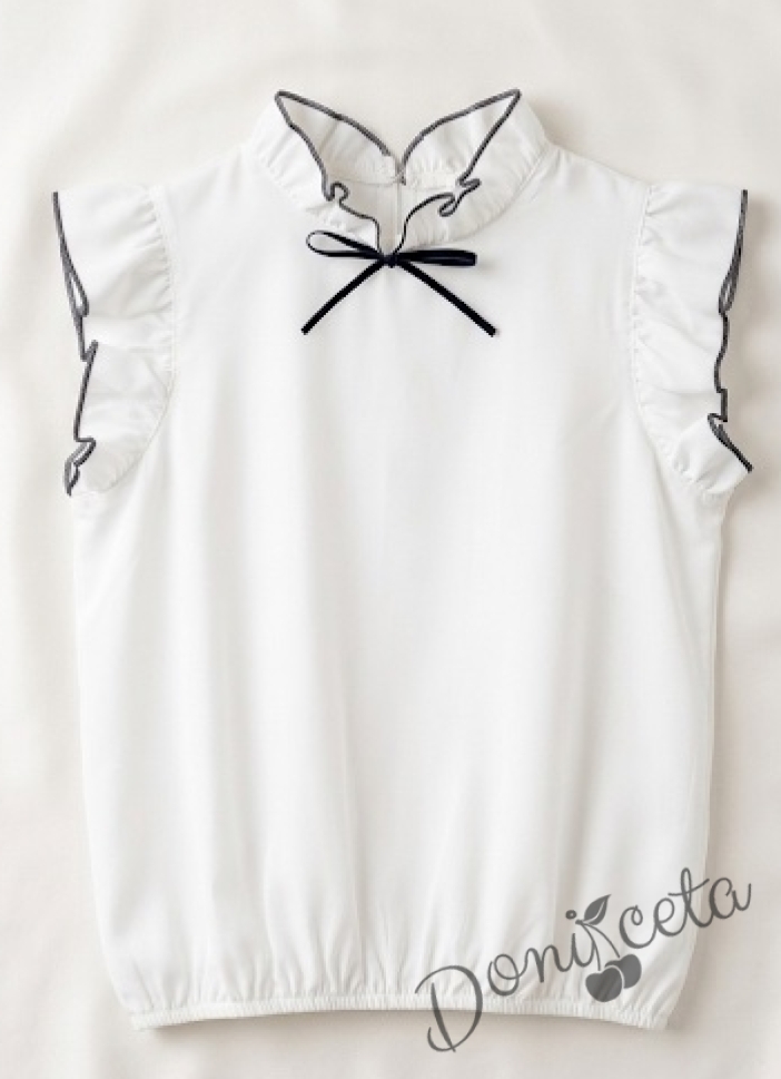 Блузата е изработена от мека и дишаща материя в нежен бял цвят. Късите ръкави с къдрички добавят игривост и свежест. Декоративната панделка придава допълнителен акцент и елегантност. Блузата е лесна за обличане и съчетаване с други дрехи.