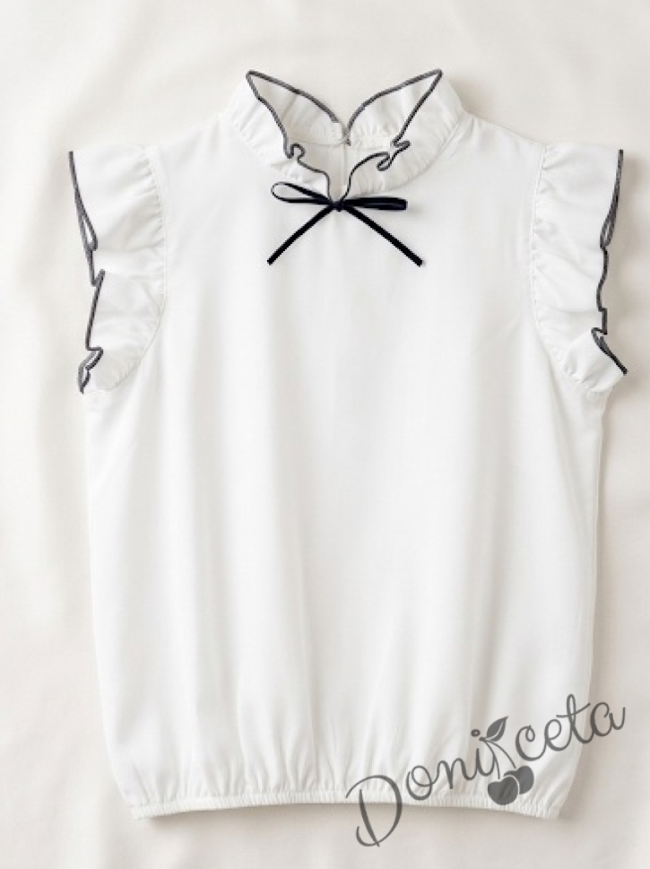 - Бяла блузка с къс ръкав: Класическа бяла блузка с къс ръкав и къдрички , която е елегантна и удобна, подходяща за всеки сезон.
