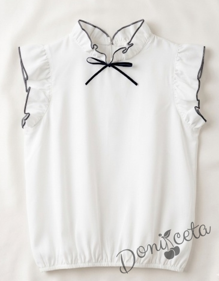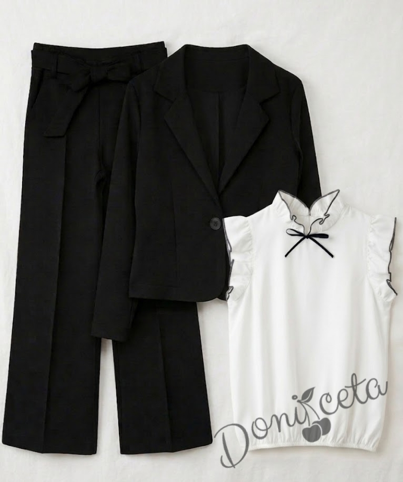 Комплект за момиче от 3 части - сако Ким, панталон с висока талия и коланче в черно и блуза с къс ръкав с панделка и къдрички в черно Contrast