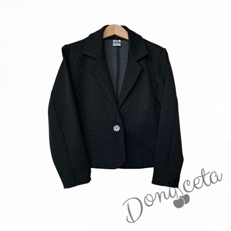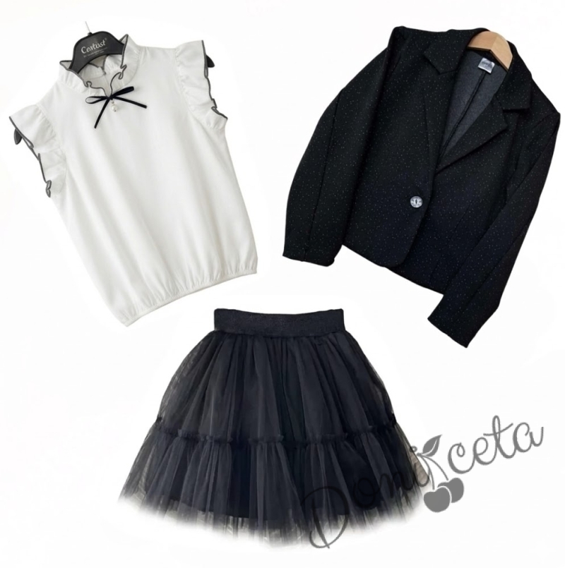 Начало МОМИЧЕТА Комплект от 3 части-блузка с къс ръкав в бяло с панделка и къдрички , тюлена пола Contrast и сако Ким в черно на ситни точици