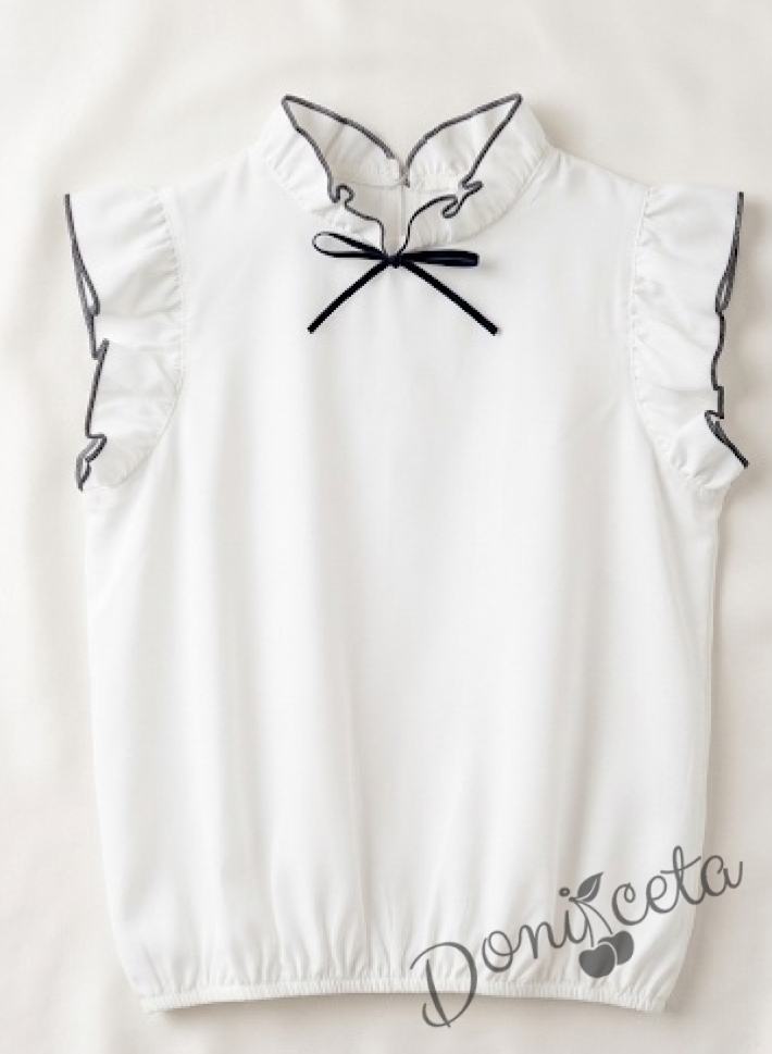 Ризата е изработена в  бял цвят и е декорирана с деликатна панделка, която придава нежен и закачлив акцент. Ръкавите с къдрици добавят допълнителна доза елегантност и женственост. Леката и удобна материя осигурява комфорт през целия ден.