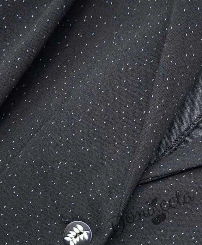 • Черно сако Ким: Завършете визията с това стилно сако, което добавя увереност и изтънченост. Класическият дизайн с едно копче и малките бели точки го правят уникален и подходящ за всеки специален повод.