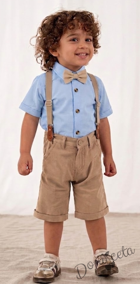 Комплект за момче от 4 части - риза в светлосин цвят с къс ръкав и бежови копчета, къси панталони, папийонка и тиранти в бежово