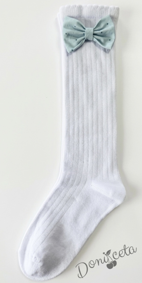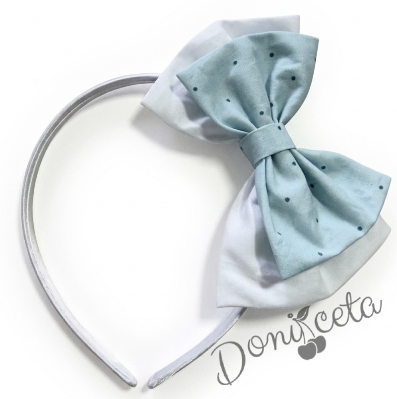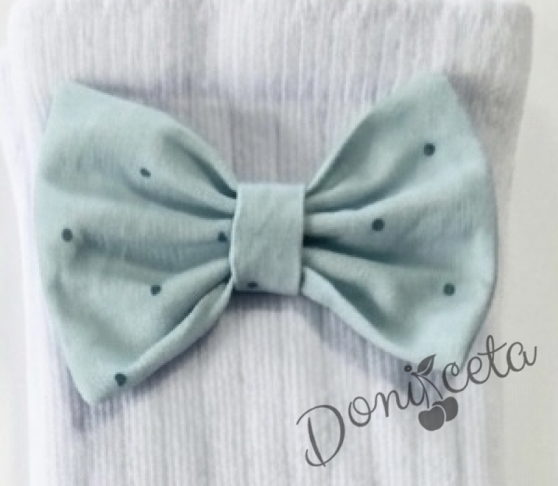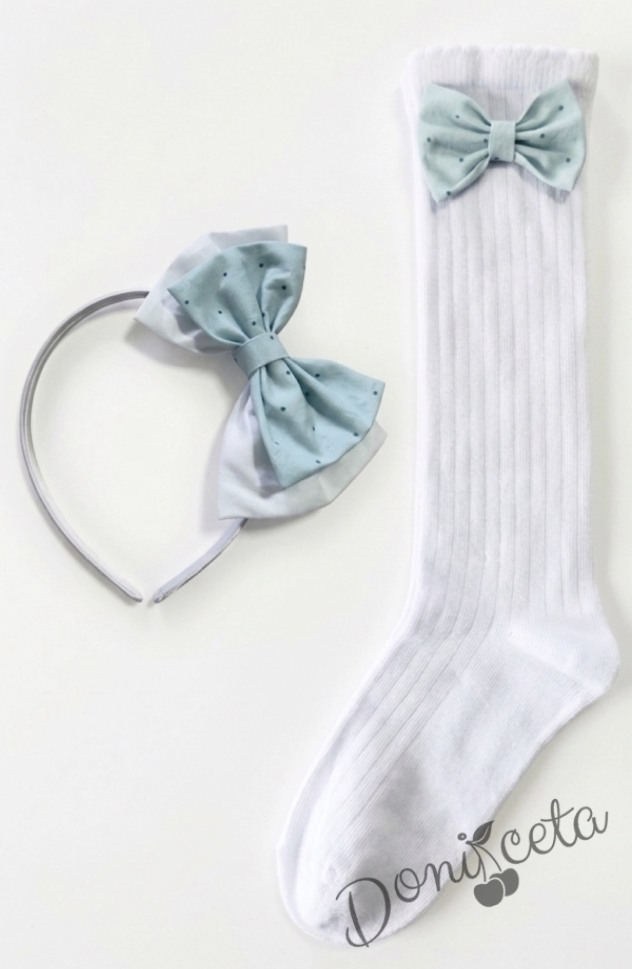 - Комплект от чорапки и диадема, който се състои от ръчно изработена диадема и чорапки с панделки в тюркоаз на бели точици.