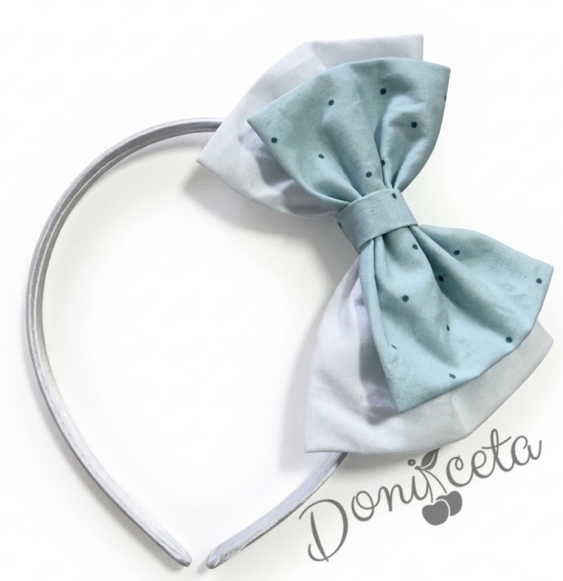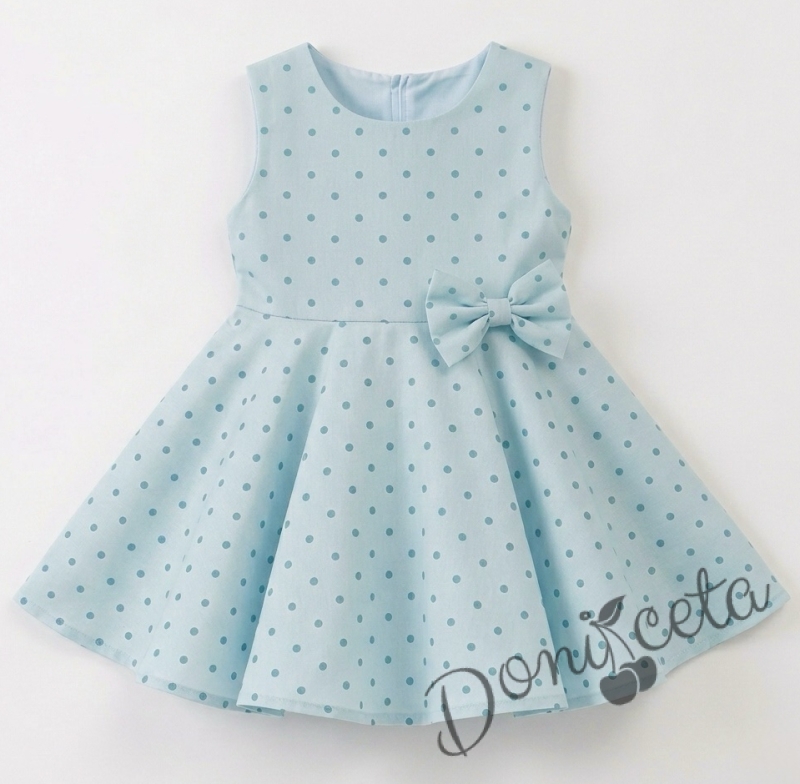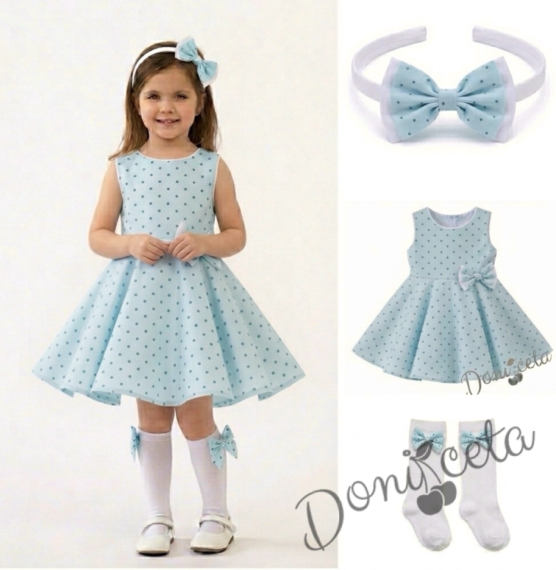 - Комплект от красива детска/бебешка памучна рокля в нежен тюркоазен цвят на точки с диадема и чрапки с панделки от плата на роклята.