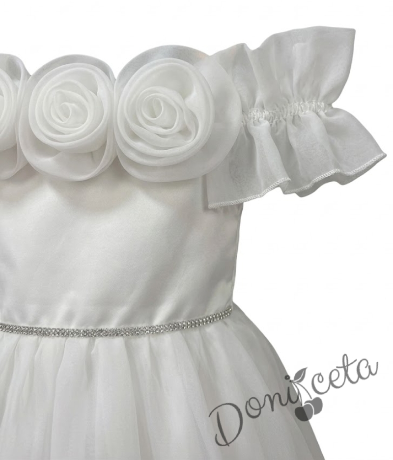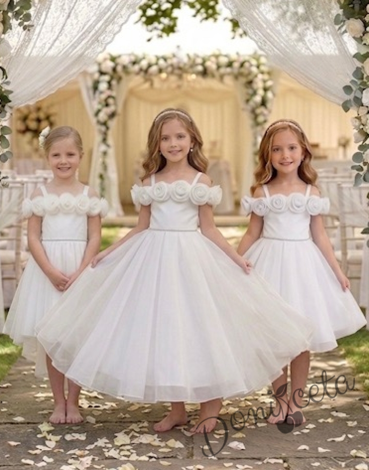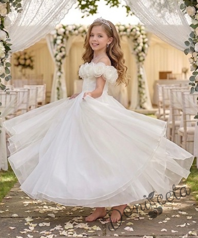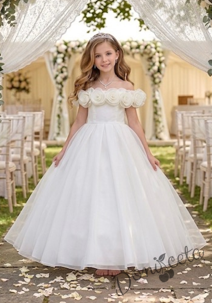 Дълга официална детска рокля Вяра с деколте декорирано с обемни 3D рози в бяло