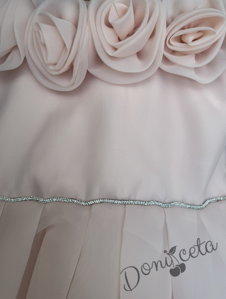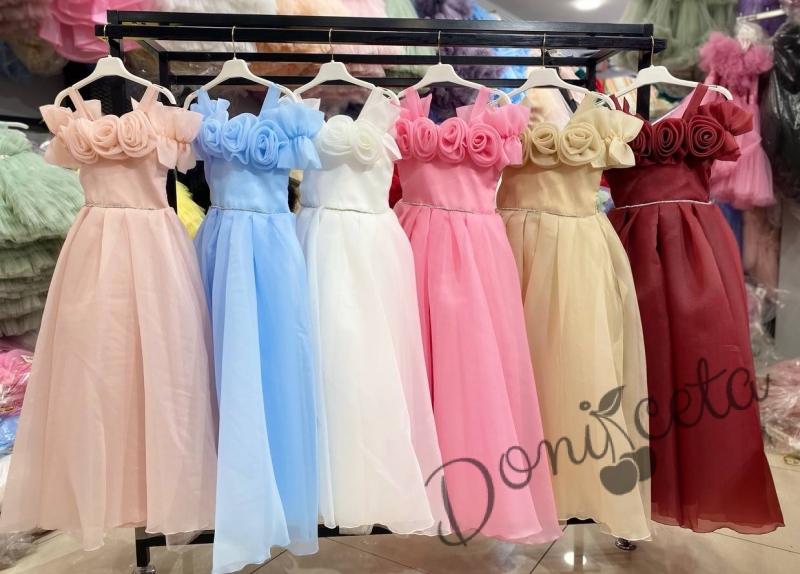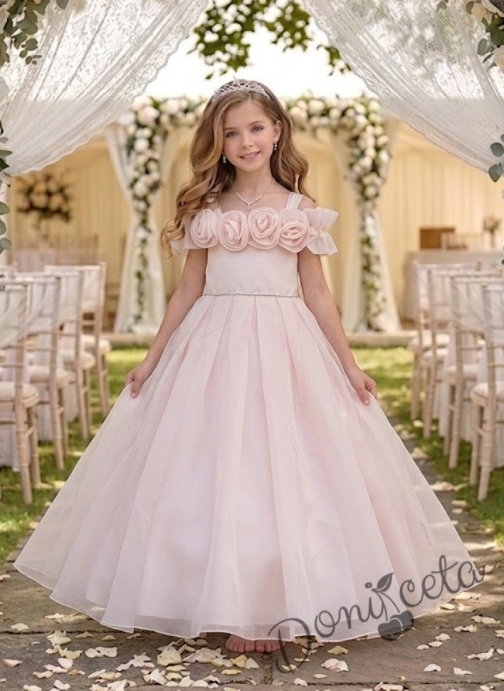 Дълга официална детска рокля Вяра с деколте декорирано с обемни 3D рози в пепел от рози