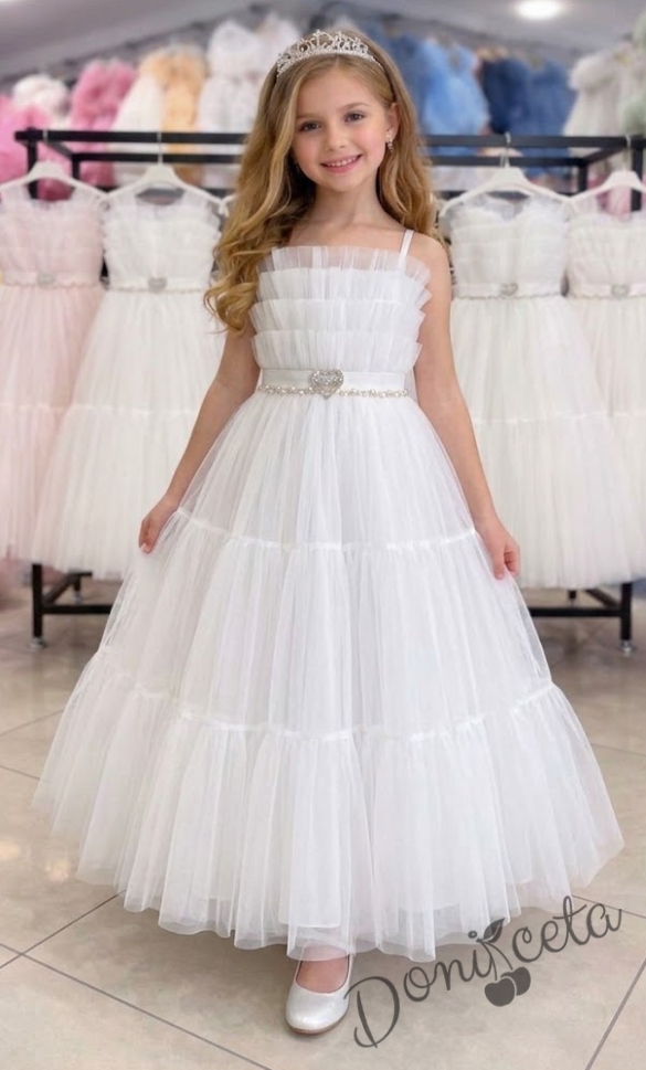 Дълга официална детска рокля Сиянa с колан във формата на сърце в бяло