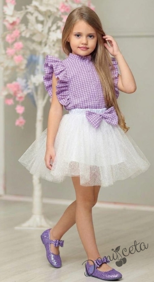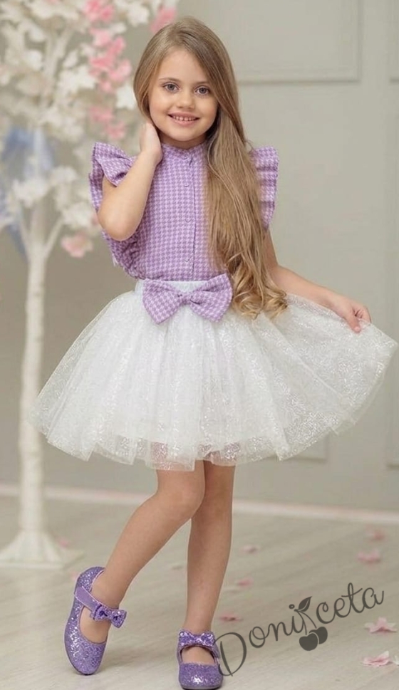 Комплект за момиче от 2 части - карирана риза с къс ръкав и туту пола в бяло