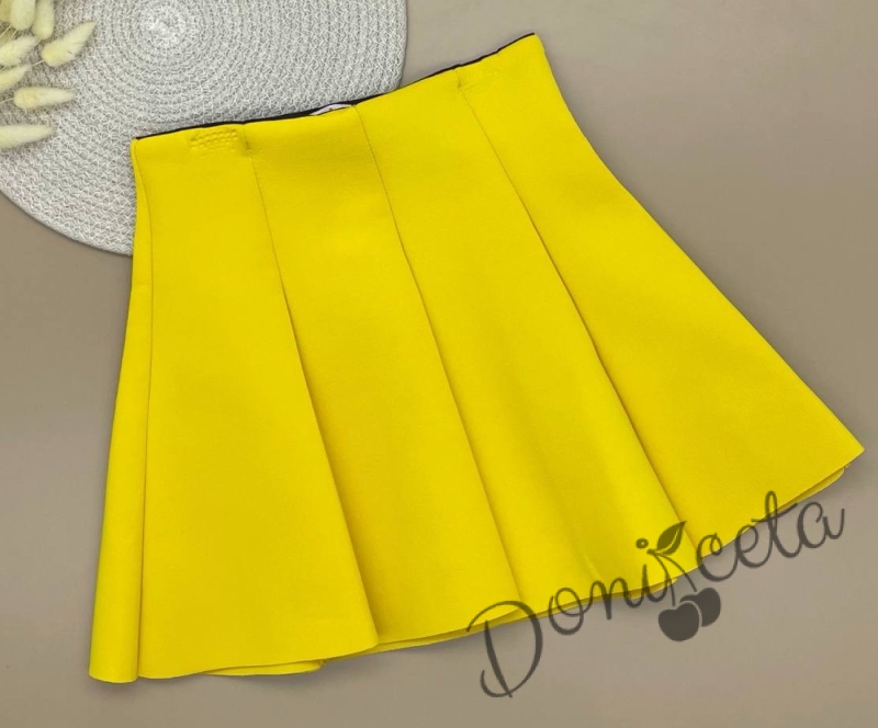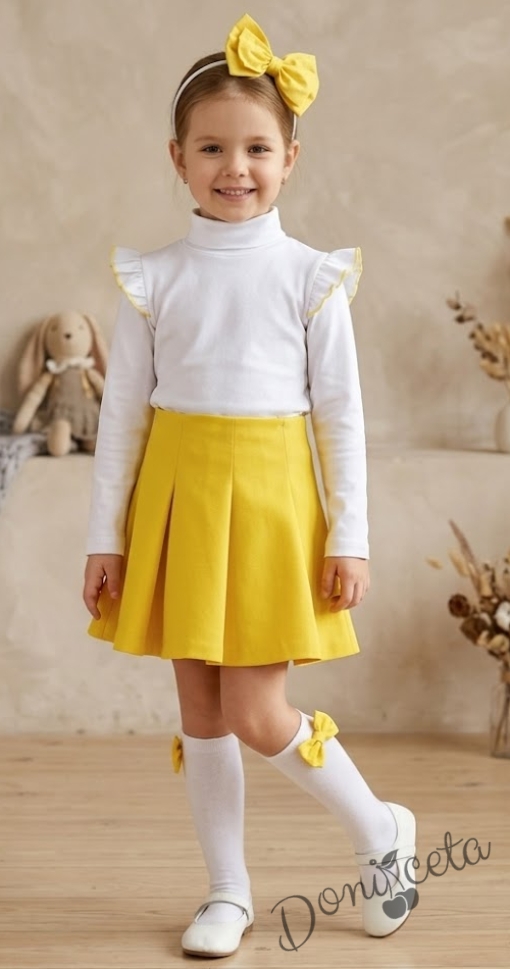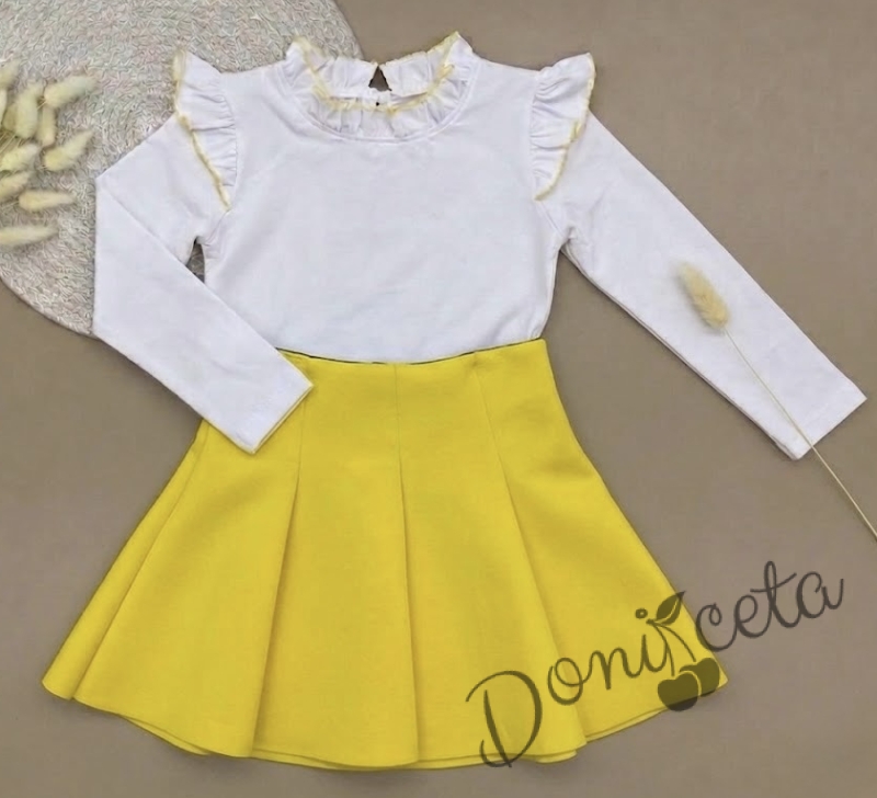 Комплект от пола в жълто и блузка в бяло с дълъг ръкав с къдрички в жълто