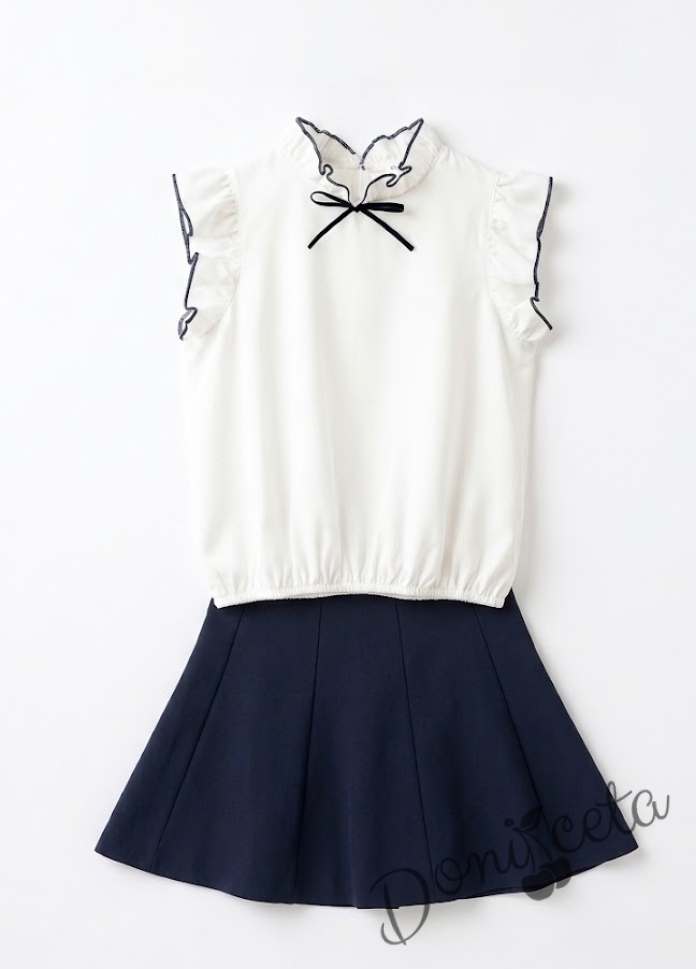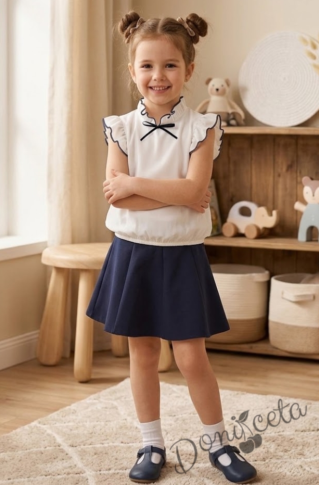 Детска риза за момиче в бяло с къс ръкав Contrast с тъмносиня панделка