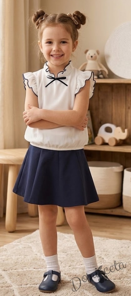 Детска риза за момиче в бяло с къс ръкав Contrast с тъмносиня панделка