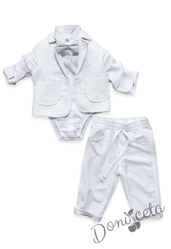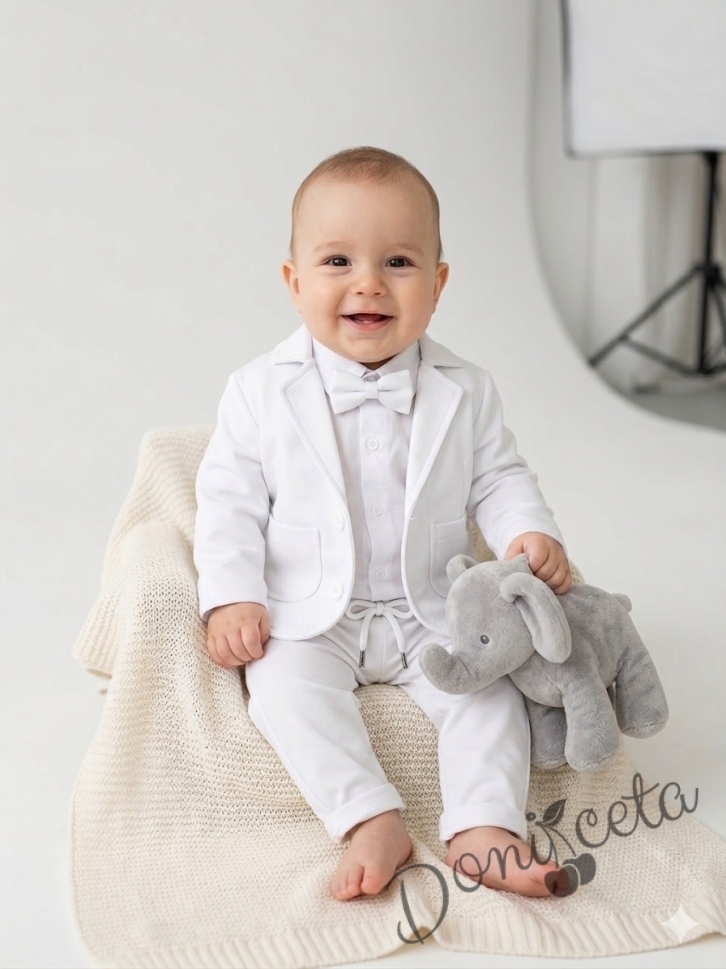 Официален бебешки костюм за момче от 4 части - сако в бяло, риза в бяло, панталон и папийонка в бяло
