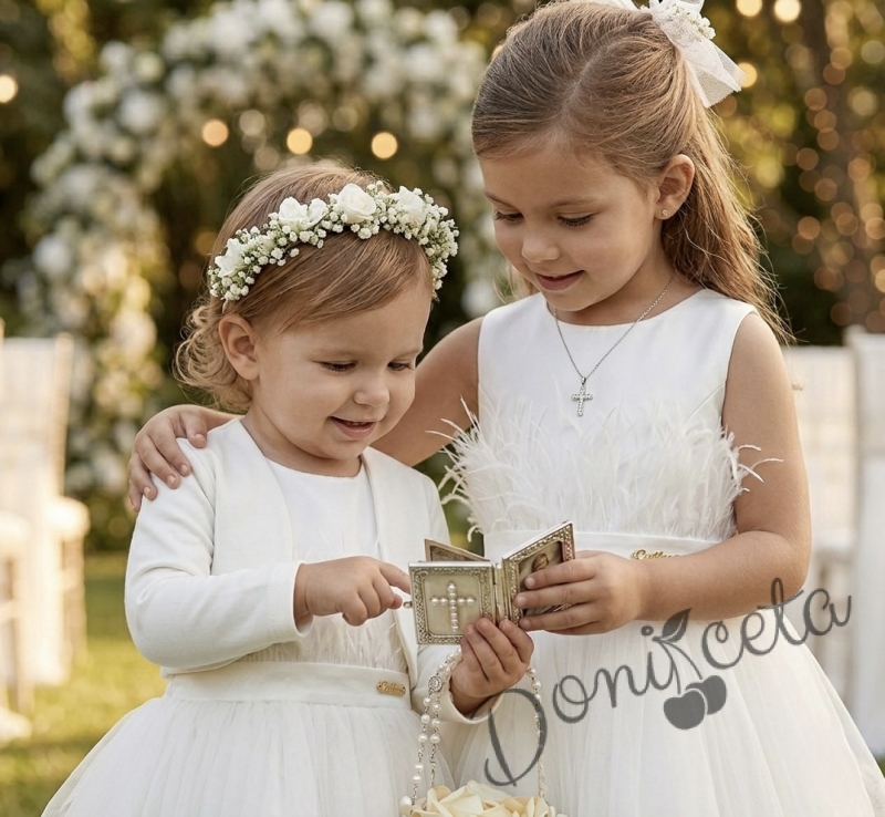 • За уникална визия може да поръчате и специално ръчно-изработена диадема или панделка, а за да превърнете всеки празник в незабравим спомен изберете и топло палтенце в бяло !