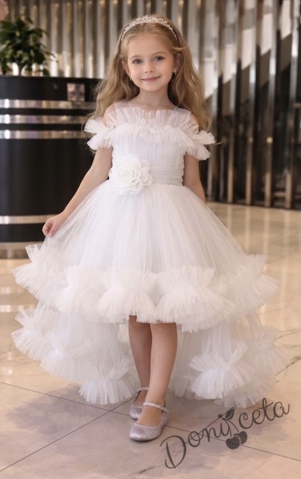 Официална празнична детска рокля Мелиса в бяло с ефирен тюл с шлейф