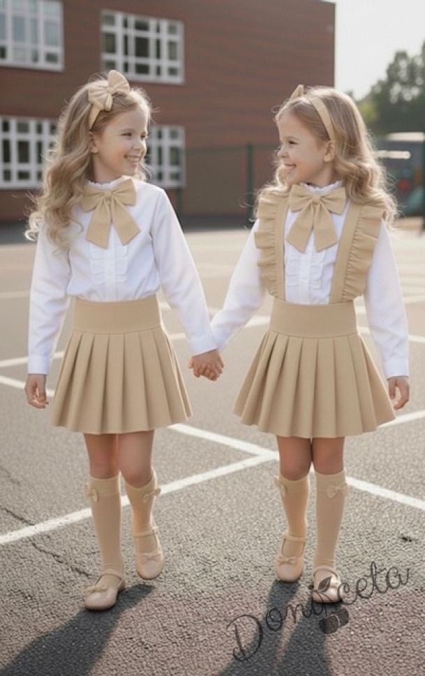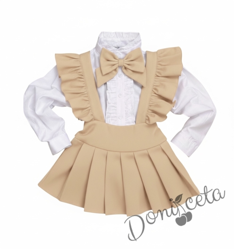 Комплект за момиче от 3 части- сукман Гери от трико в бежово с плисирана пола, риза в бяло с дълъг ръкав и къдрички и панделка