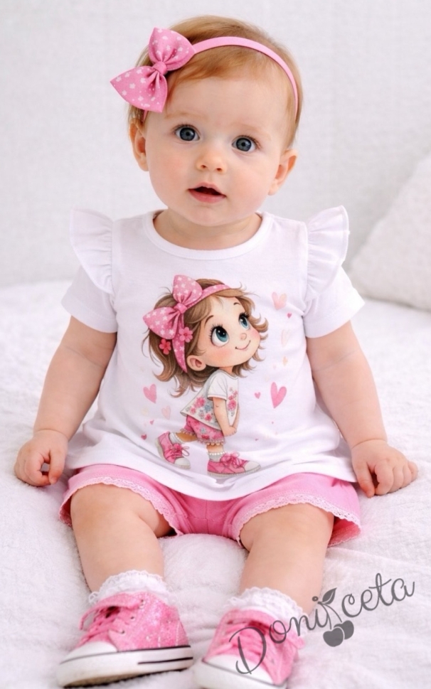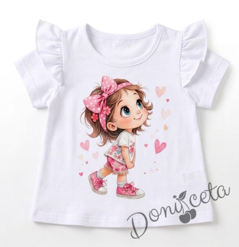 - Блузка с къс ръкав за бебе момиче в бяло с апликация и къдрички на рамената.