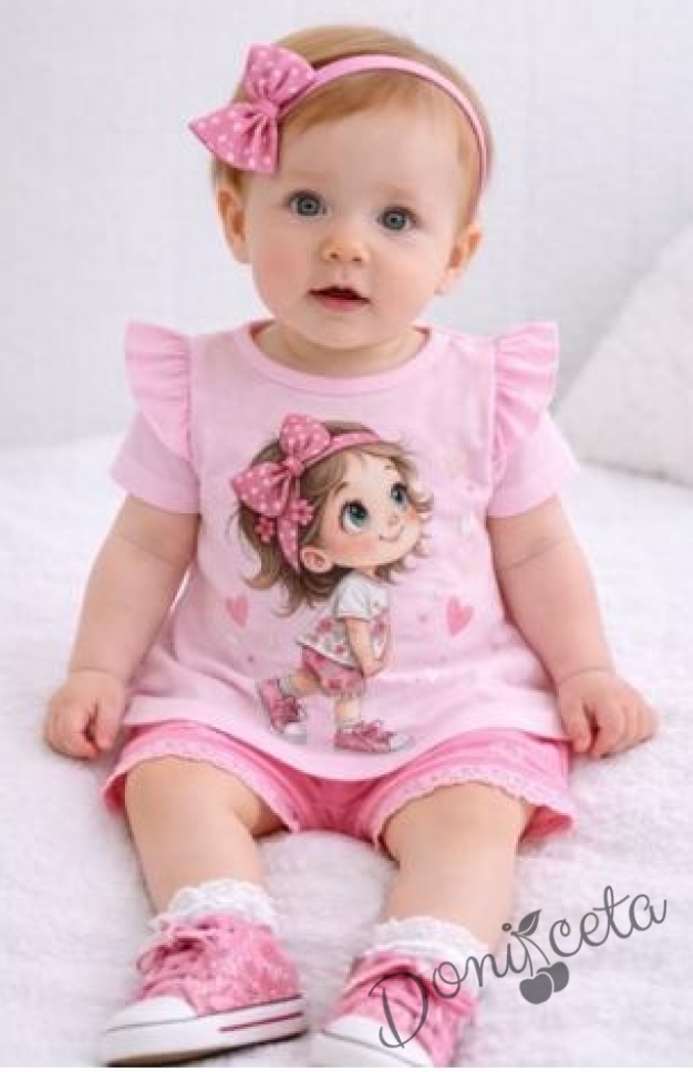 - Блузка с къс ръкав за бебе момиче в розово с апликация и къдрички на рамената.
