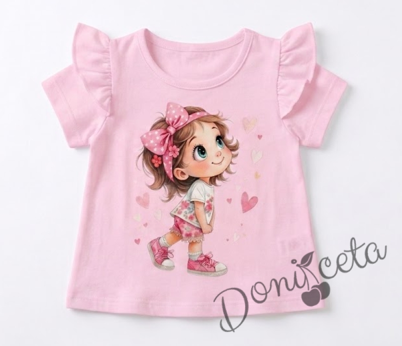 Блузка с къс ръкав за бебе момиче в розово с апликация