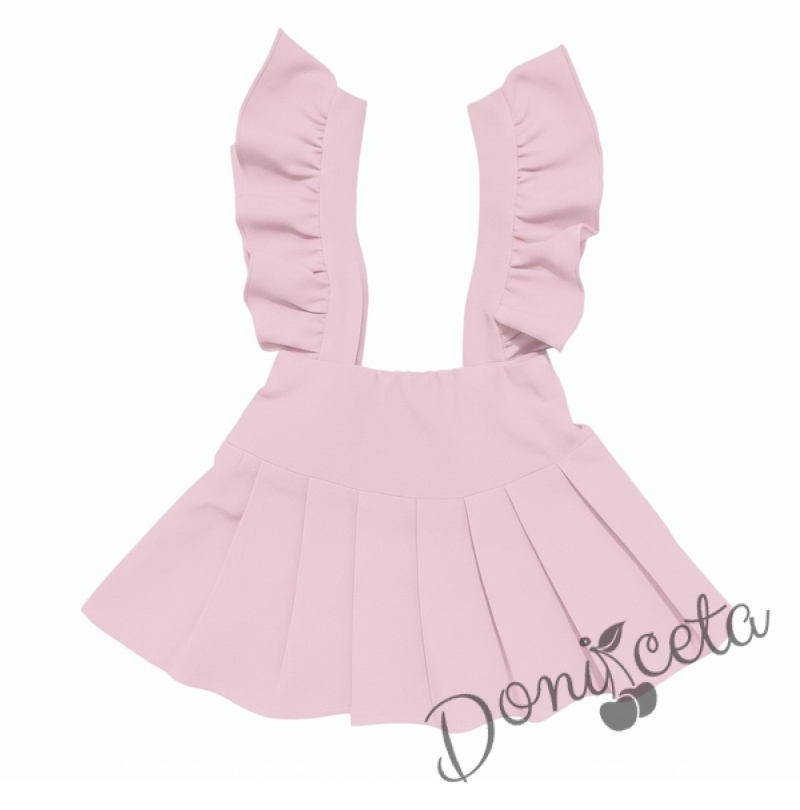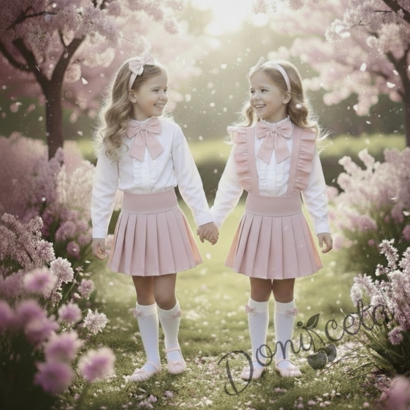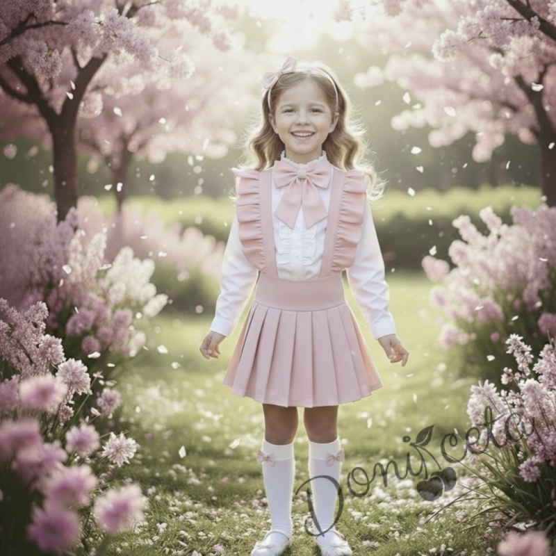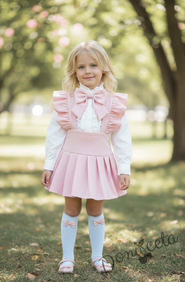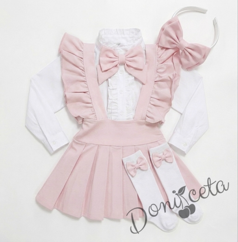 Начало МОМИЧЕТА Комплект за момиче от 5 части- сукман Гери в розово с плисирана пола, риза в бяло с дълъг ръкав и къдрички с панделка в розово, чорапки и диадема