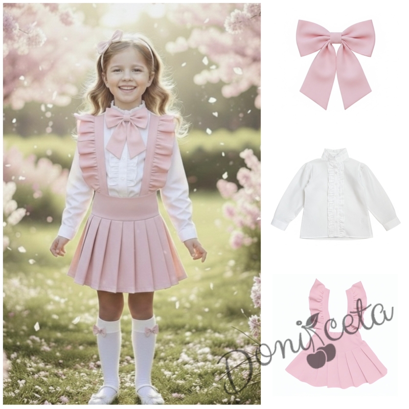 Комплект за момиче от 5 части- сукман Гери в розово с плисирана пола, риза в бяло с дълъг ръкав и къдрички с панделка в розово, чорапки и диадема