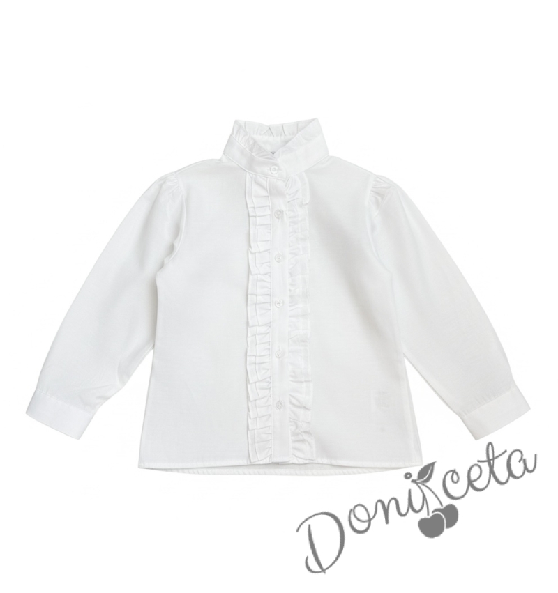 • Риза с дълъг ръкав: Класическа бяла риза, украсена с нежни къдрички и виоска яка в розово, които добавят финес и елегантност.