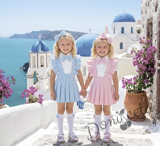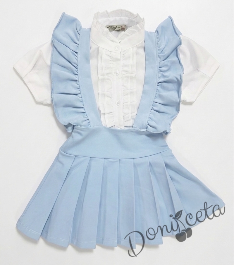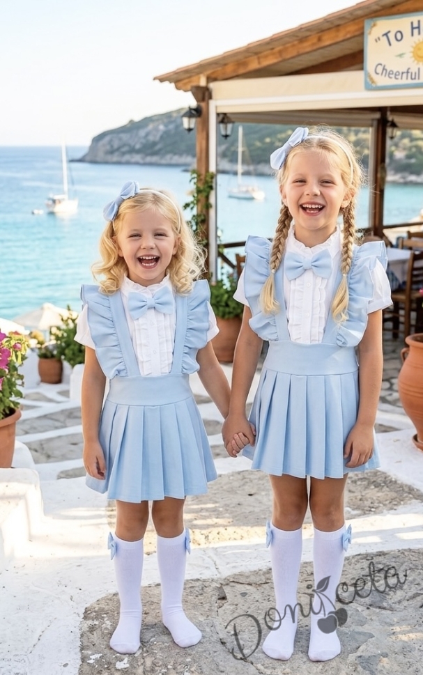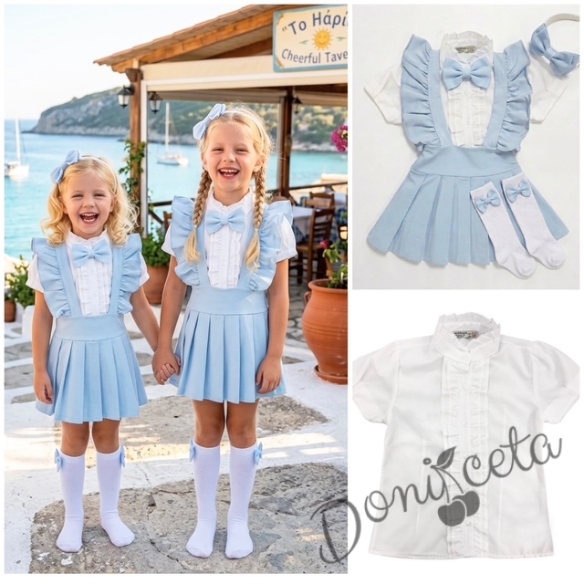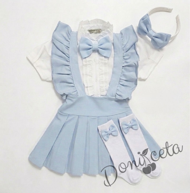 Комплект за момиче от 5 части- сукман Гери в светлосиньо с плисирана пола, риза в бяло с къс ръкав и къдрички с панделка, чорапки и диадема