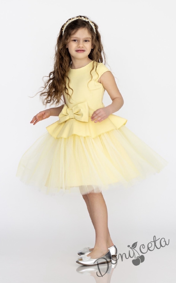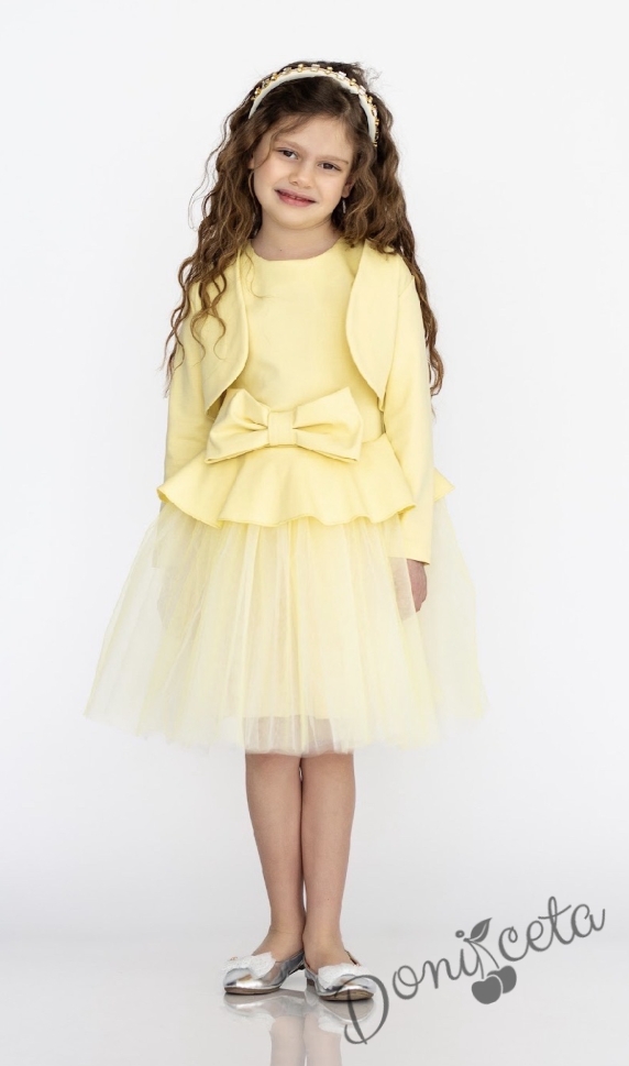 Комплект от детска рокля с къс ръкав с тюл и панделка в жълто и болеро Contrast
