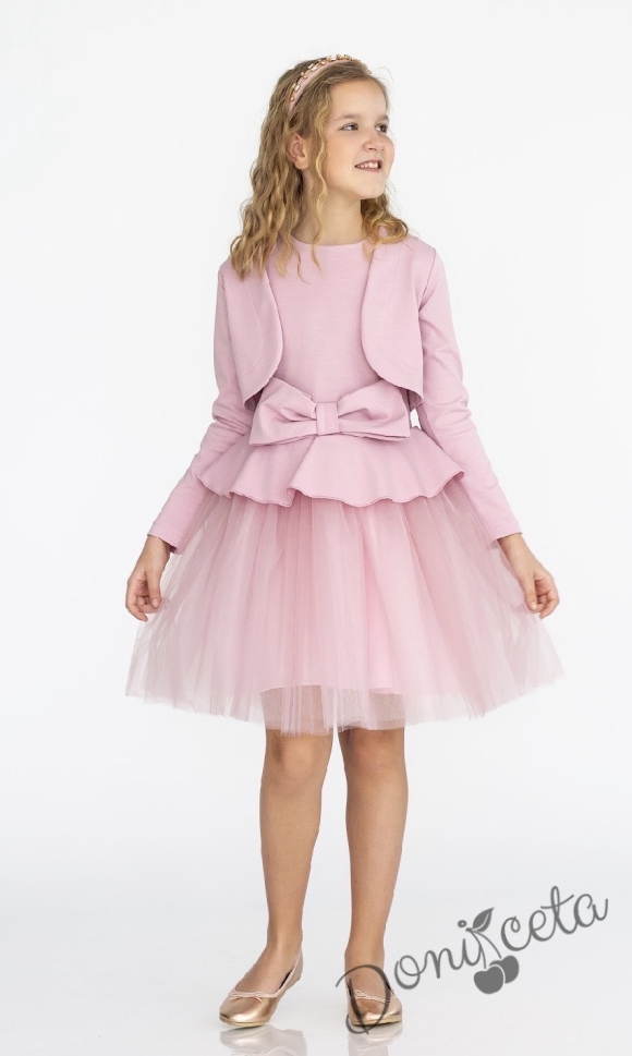 Начало МОМИЧЕТА Комплект от детска рокля с къс ръкав с тюл и панделка в розово и болеро Contrast