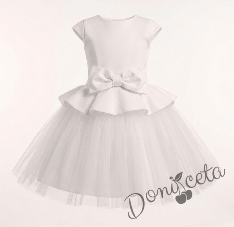 Комплект от детска рокля с къс ръкав с тюл и панделка в бяло Ема и болеро
