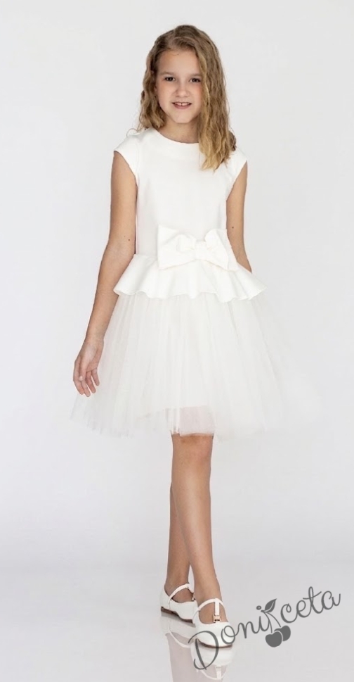 Комплект от детска рокля с къс ръкав с тюл и панделка в бяло и болеро Contrast