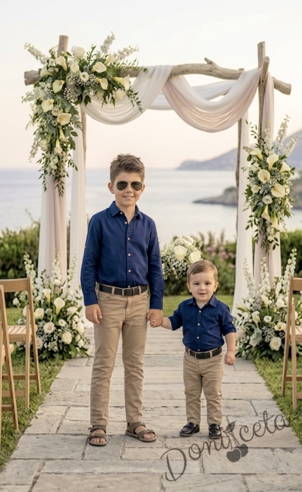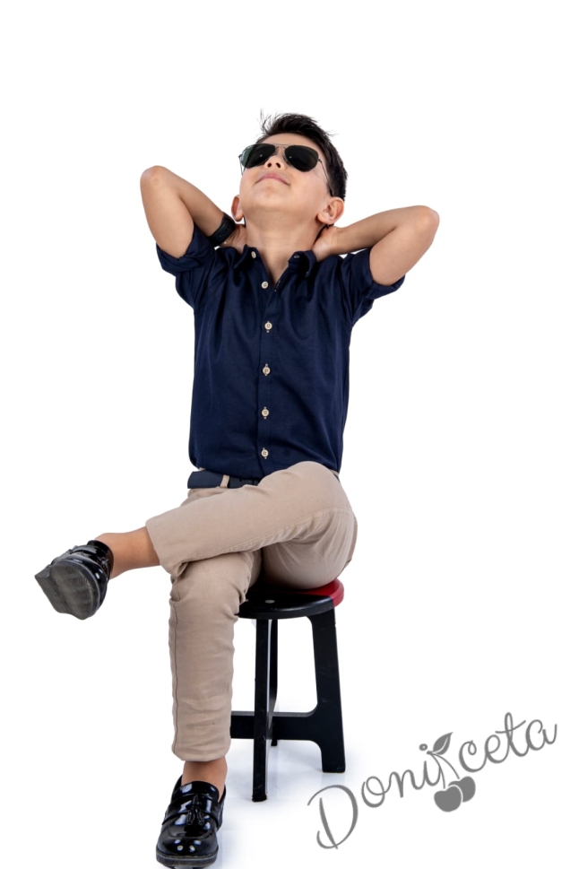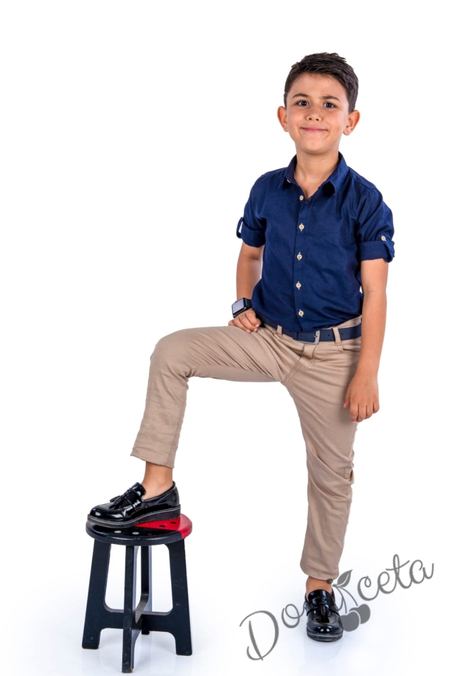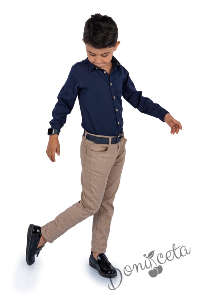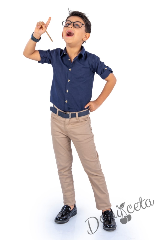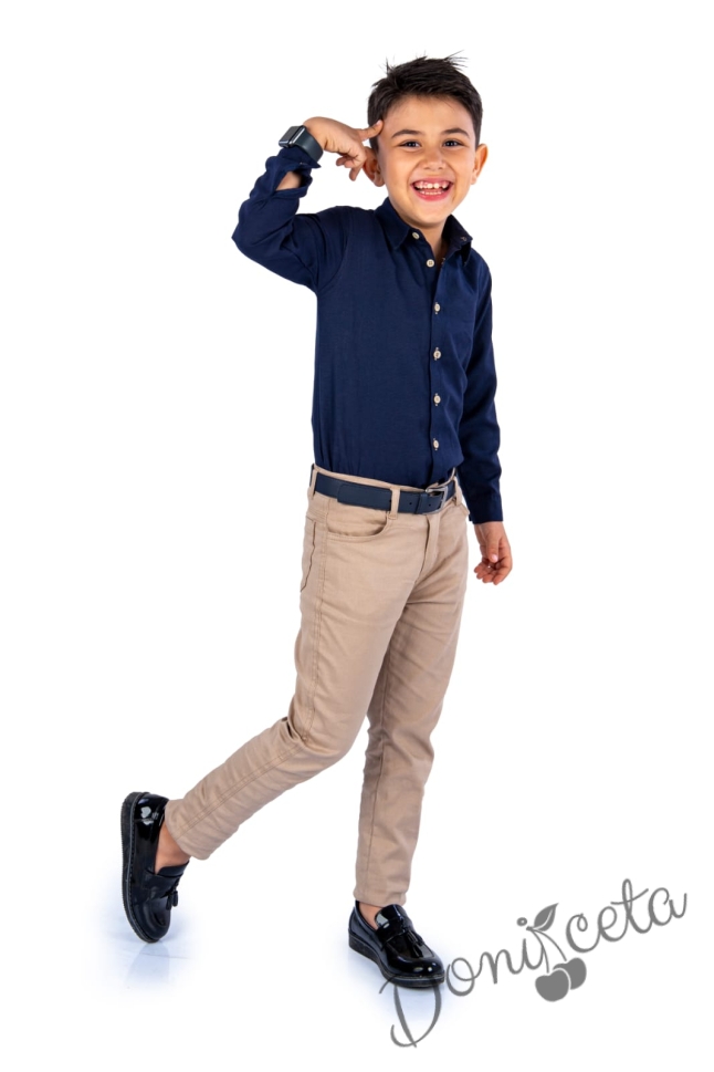Детски комплект от риза с дълъг ръкав в тъмносиньо с дълъг панталон в бежово с колан