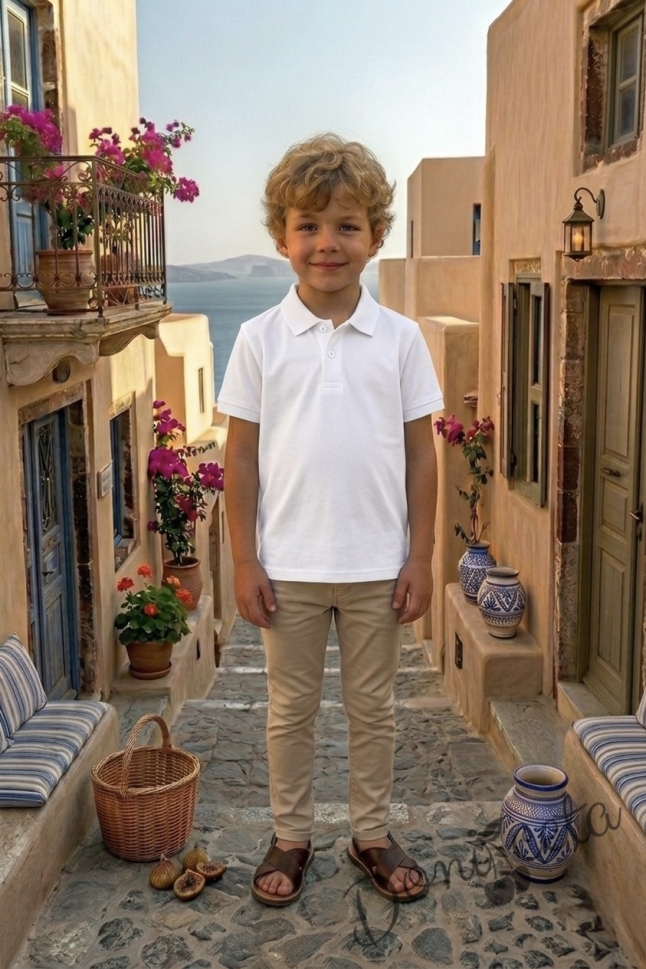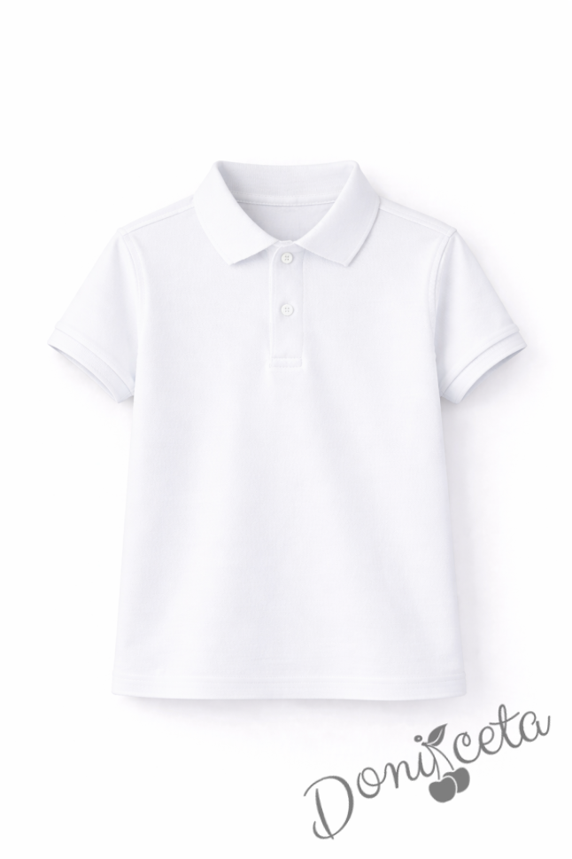 Комплект за момче състоящ се от панталон в бежово и блузка с яка в бяло.