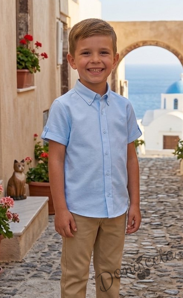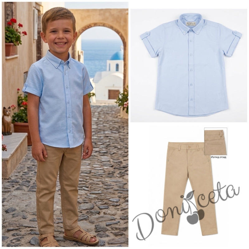 Летен комплект за момче от риза с къс ръкав в светлосиньо и дълъг панталон в бежово