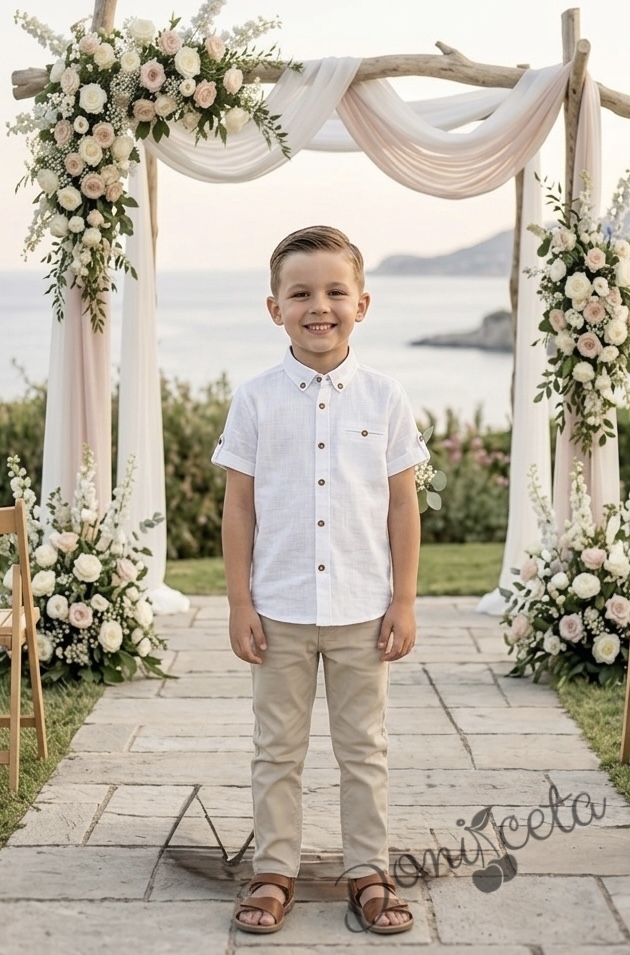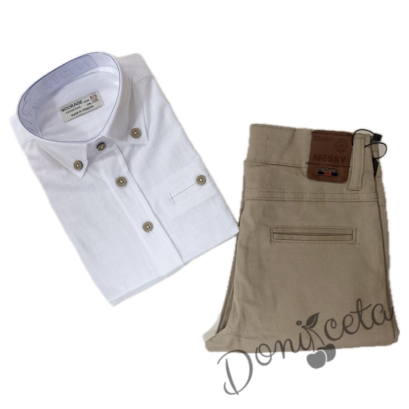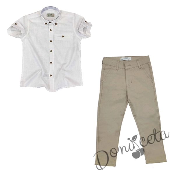 Летен комплект за момче риза с къс ръкав в бяло с копчета в бежово и дълги панталони в бежово
