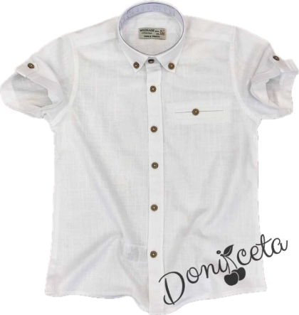 Летен комплект за момче от риза с къс ръкав в бяло и къси дънки в синьо
